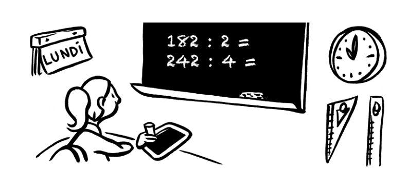 C’est lundi. Ce matin, Zoé a un contrôle de maths à onze heures. Elle a révisé à la maison avec ses copains. Le professeur donne des divisions, Zoé note plusieurs résultats sur son ardoise. Elle doit aussi mesurer les côtés d’un losange. Elle emprunte la règle de son voisin.