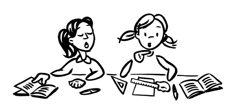 Rachel et Esméralda sont dans la salle de permanence parce qu’il n’y a pas cours. Elles prennent leurs livres pour faire des exercices. Rachel commence par l’exercice de maths : « Tracez un segment AB de cinq centimètres et placez un point C sur ce segment. » Oh là là ! C’est difficile ! Rachel doit tout effacer et recommencer parce qu’elle s’est trompée. Esméralda va réciter les 26 lettres de l’alphabet français sans regarder la leçon : « a, b, c, d, e, f, g, h, i, j, k, l, m, n, o, p, q, r, s, t, u, v, w, x, y, z. » C’est facile !