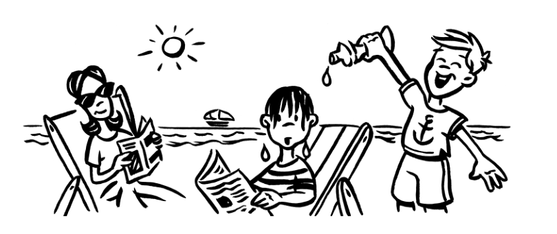 Toute la famille est à la mer. La maman est dans son fauteuil de plage, elle a mis des lunettes de soleil. La petite fille en maillot vert cherche des coquillages. Le garçon a renversé une bouteille d’eau sur la tête de son père : il est tout mouillé !