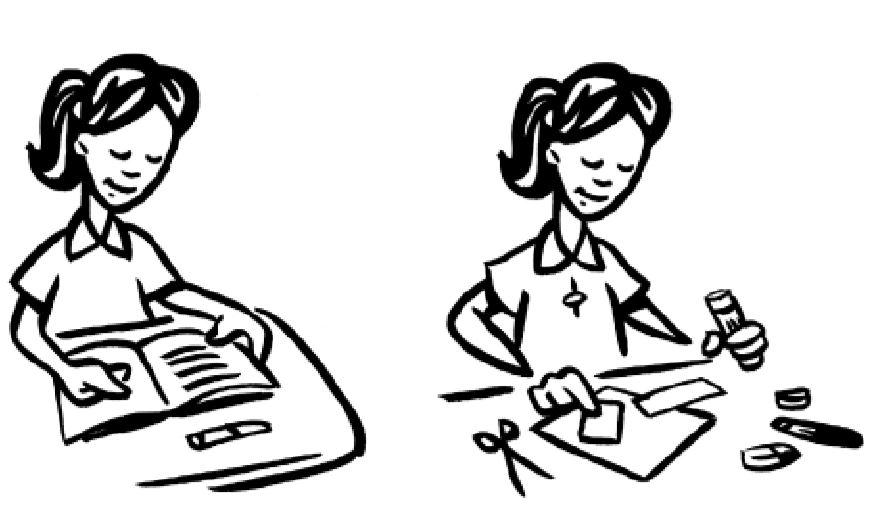 La fille lit des mots et colle des images